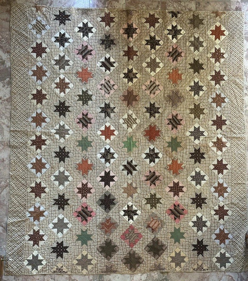 Antique Civil War Era Quilt LeMoyne 8 Point Star Calico Madder Green Copper-
