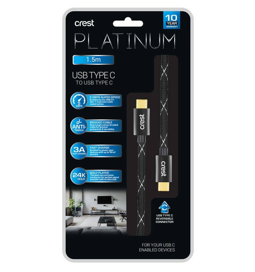 Crest Platinum Ultimate Dual Shielded USB Type C to USB Type C Cable 1.5m NEW