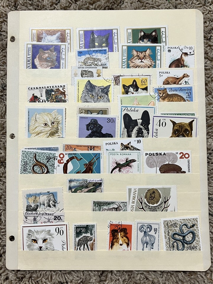 WORLDWIDE ANIMAL STAMPS LOT IN STOCK PAGE REPTILES, CATS, DOGS, HORNED & MORE-