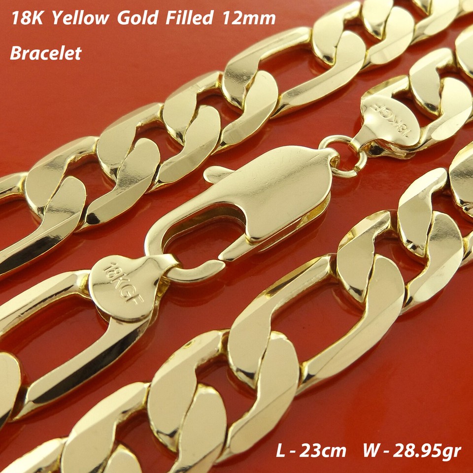 Figaro Bracelet 18k Yellow Gold Filled Solid Men's 3 x 1 Link Bangle 23cm