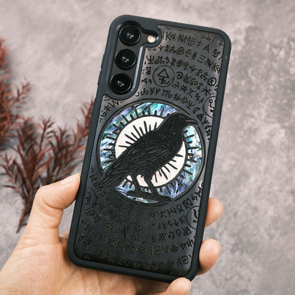 Hand-inlaid Wood Case for Samsung Galaxy S24 S23 S22 S21 Ultra FE Plus 5G Raven-
