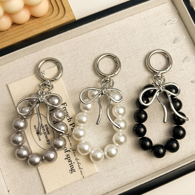 Ins Style Pearl Beads Keychain Metal Bowknot Phone Pendant Bag Decor Car Keyring
