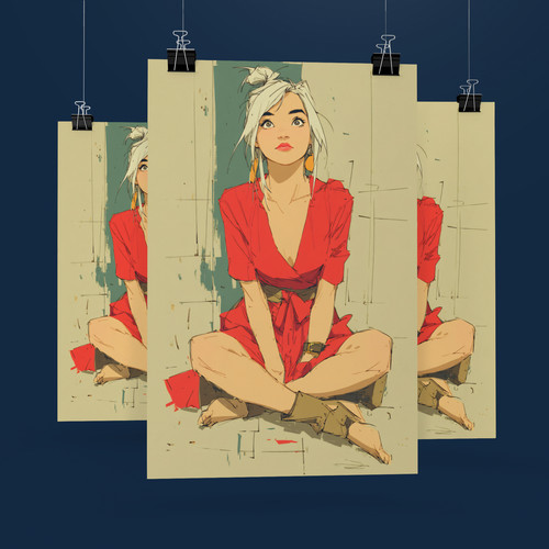 Girl in Red Dress Poster Sitting Relaxed Minimal Art Print Wall Decor